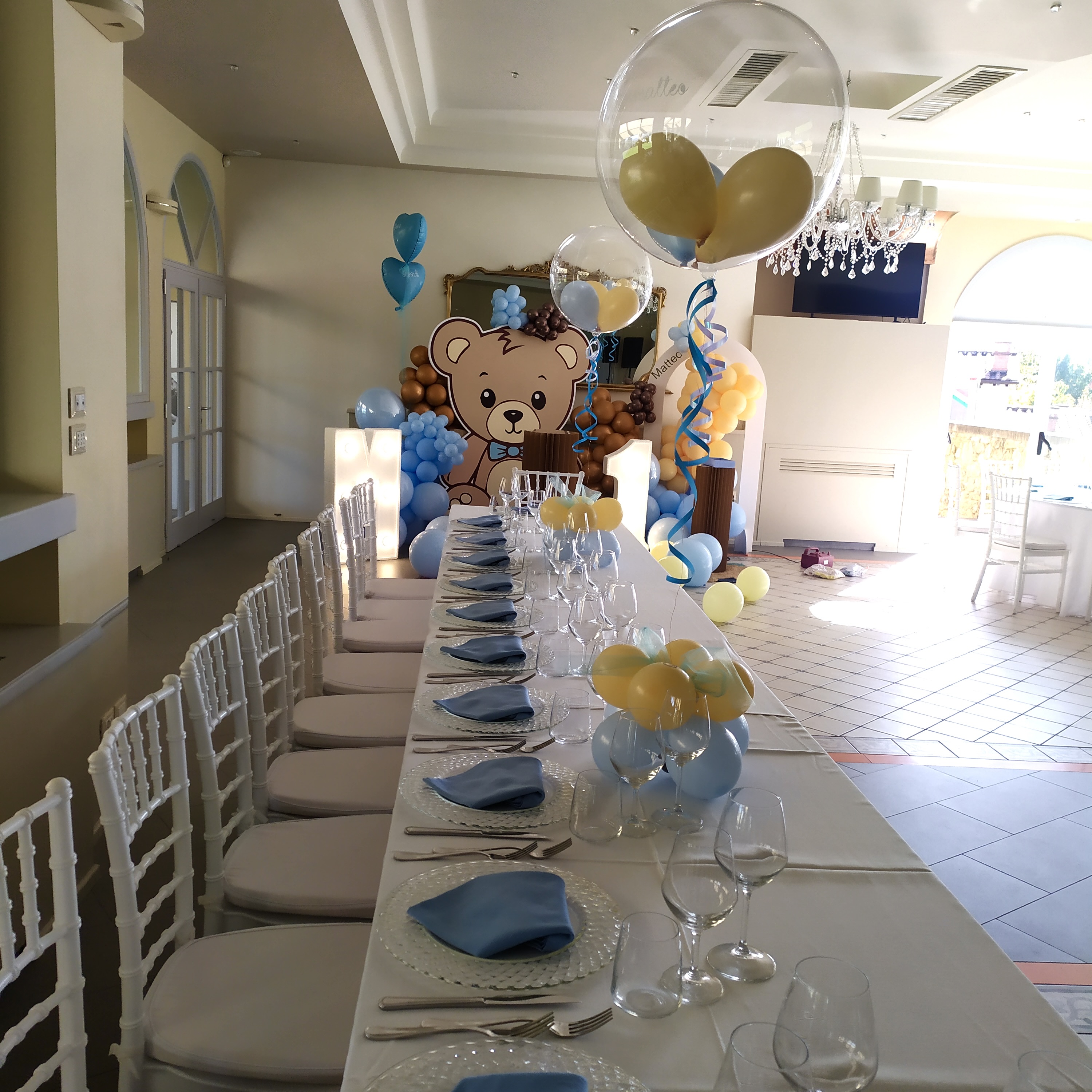 La sua moderna versatilità è impreziosita dall'affaccio sulla veranda che crea un tutt'uno col giardino, da specchi antichi ed eleganti lampadari di cristallo, resa accogliente dal color pastello delle pareti.