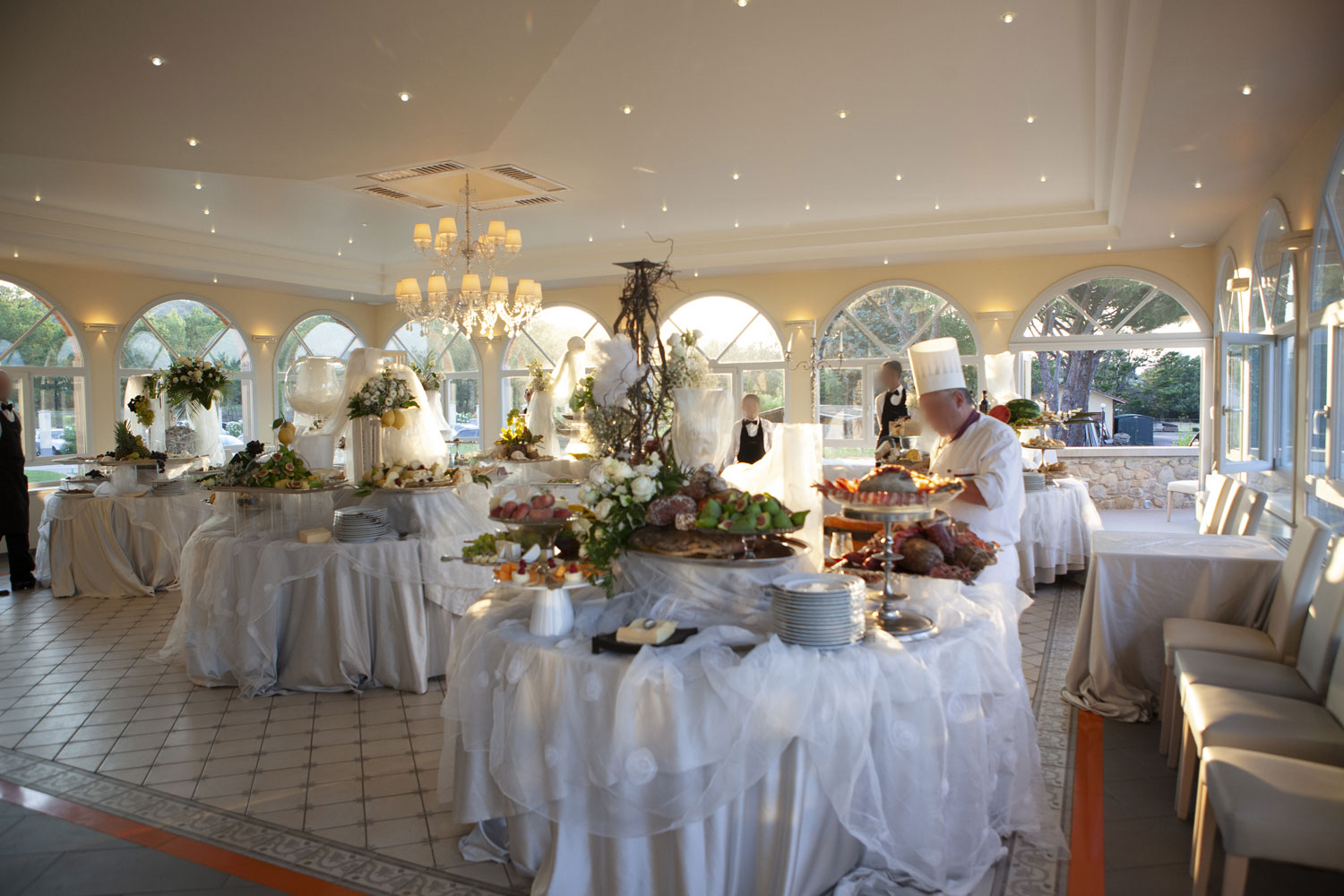 Un piccolo gioiello perfettamente illuminato su tre lati da grandi vetrate che guardano il rigoglioso giardino e da raffinati lampadari in cristallo.